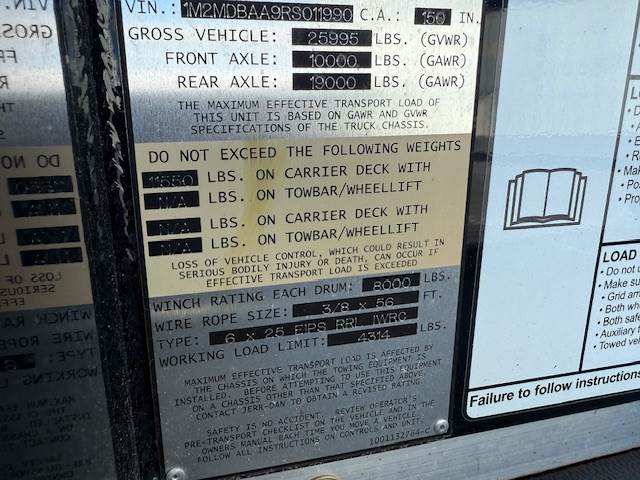 Stock: S011990 VIN: 1M2MDBAA9RS011990 Year: 2024 Make: Mack Model: MD Engine: Cummins 6.7L Mileage: 4621 Horsepower: 235HP Fuel Type: Diesel Transmission: Automatic Transmission Color: White Class: 8 Category: Flatbed Rollback Truck Cab Type: Regular GVWR: 25999lbs Wheelbase: in Front Axle: 10,000 lbs Rear Axle: 19,000lbs Brake Type: Air Front Tire: 11R22.5 Rear Tire:11R22.5 Features: -22Ft Rollback Bed -Jerr-Dan Bed Model#22NGAF6T-W-LP -Deck Capacity 12,000lbs -50 Gallon Fuel Tank -Air Ride Suspension -Back Up Camera -A/C, Power Windows and Power Locks, Cruise Control, Tile Wheel -Remaining Factory Warranty Do not let this cold weather scare you away. CRG Truck Sales is still making DEALS!! Call Rose today at 410-620-9800!!